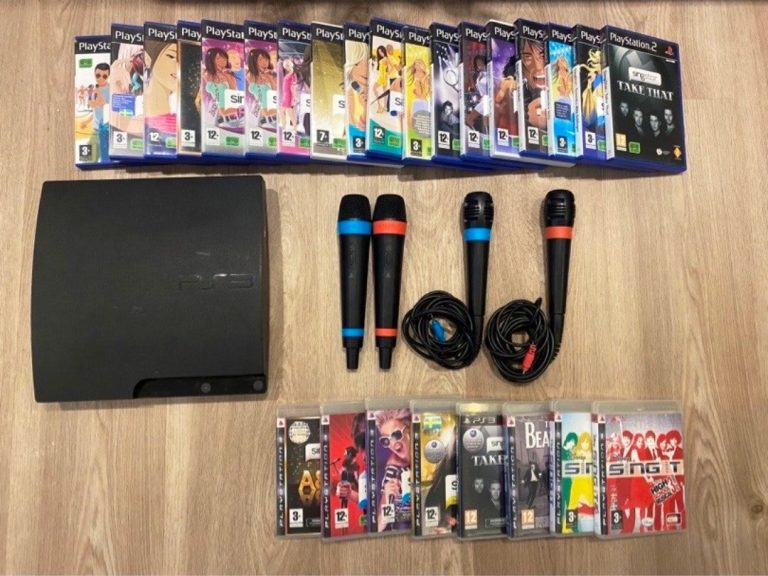 Playstation 3 med en handkontroll + all nödvändig kablage Trådlösa och vanliga Singstar-mikrofoner